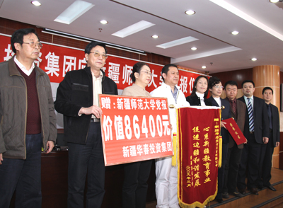 在陽春3月的25日下午,新疆華春投資集團向新疆師范大學(xué)的贈報儀式在新疆師大教學(xué)主樓學(xué)術(shù)報告廳隆重舉行。華春投資集團首期出資現(xiàn)金將近9萬元,訂購全年度的黨報《新疆經(jīng)濟報》300份,贈送給新疆師范大學(xué)的教師們,方便教師們及時學(xué)習(xí)了解黨的路線、方針、政策及國內(nèi)外各項重大信息。新疆華春投資集團為推進新疆教學(xué)人才的培育、為新疆和諧社會的構(gòu)建,從而奉獻出新疆華春投資集團的一份愛心。