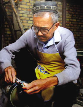 我們在另一條偏僻的小巷里,見到了“塔石罕”最小的兒子艾合買提·塔石,他今年48歲,從18歲開始學藝。由于父親的威望,來拜訪他或買小刀的人很多。我們來到他家時,他正在院中制作小刀,面前擺放著小榔頭、銼、鉆、錐、老虎鉗、砂輪、砂紙等工具,還有一些正等待加工的刀胚。他告訴我們,做小刀的工藝很復雜,要將挑選出的好鋼好鐵進行鍛打、沾火、造型、銼磨、鑲嵌銅、骨、花紋等一系列的工藝,一把好刀要四五天才能做好。我們發(fā)現(xiàn),他制作的小刀柄部均以孔雀頭為造型,上有孔雀羽毛的圖案,看上去華麗而高檔,令人愛不釋手。艾合買提·塔石給我們展示了他的不少“作品”,長短不一,最長的一把折刀拉出刀子有40厘米,明晃晃的,非常漂亮。這種刀是宰羊、殺瓜絕好的工具。艾合買提·塔石在他做的刀子上打印了“5”的字樣,謹防假冒,同時也是質(zhì)量保證的標記。