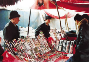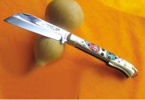 我們有幸在這街上見到了“塔石罕”的徒弟羅赫曼·芒蘇爾,他的小刀注冊了商標并在自治區(qū)獲過獎。在他的貨架上,我們見到了幾乎包括了各種類型的沙雅小刀,長度從15厘米到3厘米,五顏六色,令人眼花繚亂。如今小刀的制作技藝比過去有了進一步的提高,有的柄部還鑲嵌了銅、銀、牦牛、鹿角、山羊角、駱駝骨、玻璃鋼、寶石和有色塑料等,圖案更加豐富,做工更加講究。今年38歲的羅赫曼·芒蘇爾11歲開始學藝,他善于經(jīng)營,如今有了小汽車,一個電話,就可以把小刀送到客戶的手里。