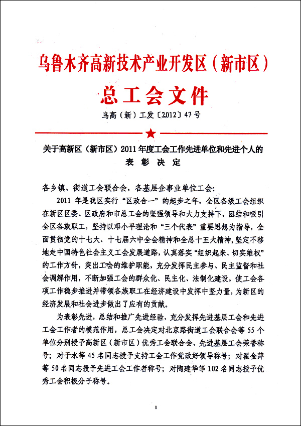 從高新區(qū)(新市區(qū))總工會、到全國總工會、工商聯(lián)、新疆自治區(qū)黨委,都對一個非公企業(yè)工會如此肯定,這不但在全疆尚屬首次,而且在全國也是首例!