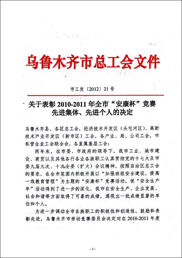 在剛剛結束的工會工作年度評比中,華春工會與華春工會主席高青被高新區(qū)(新市區(qū))總工會評為“先進基層工會一等獎”、“優(yōu)秀工會工作者”,同時榮獲由烏魯木齊市總工會、市安全生產(chǎn)監(jiān)督管理局評定的“2010-2011年安康杯競賽先進集體”。