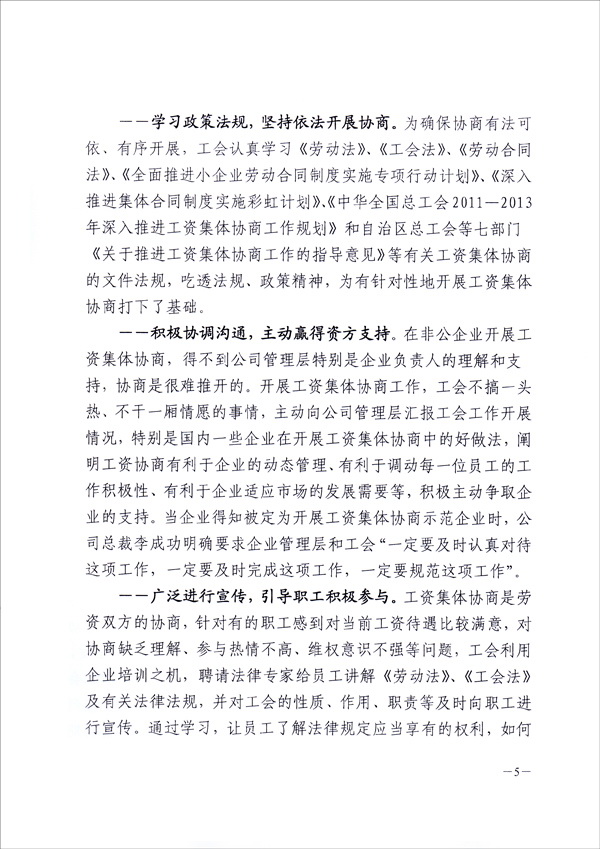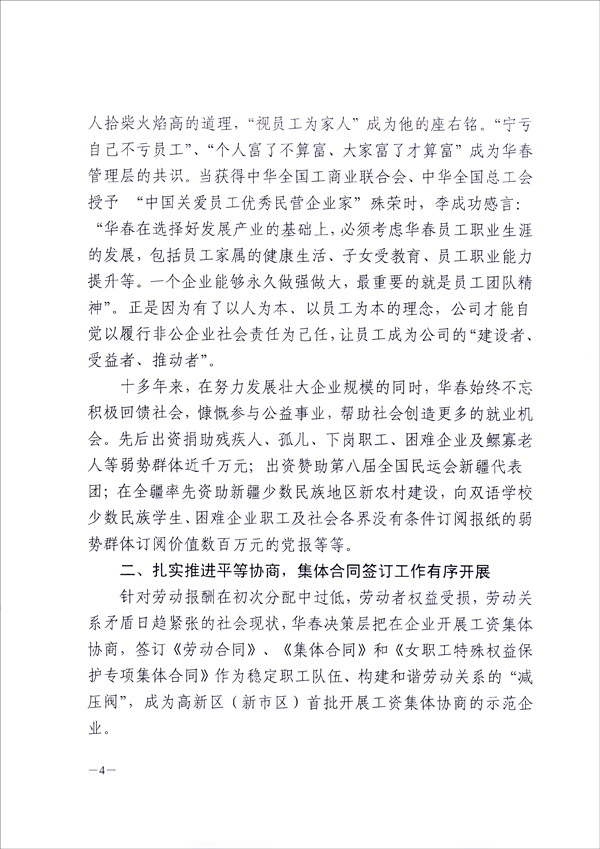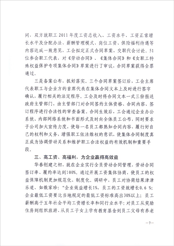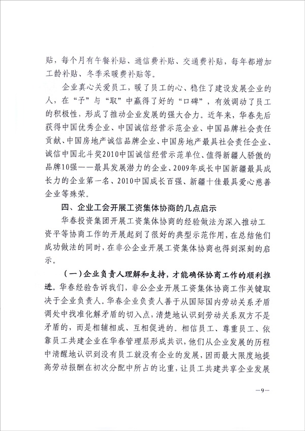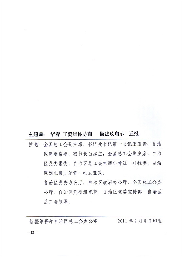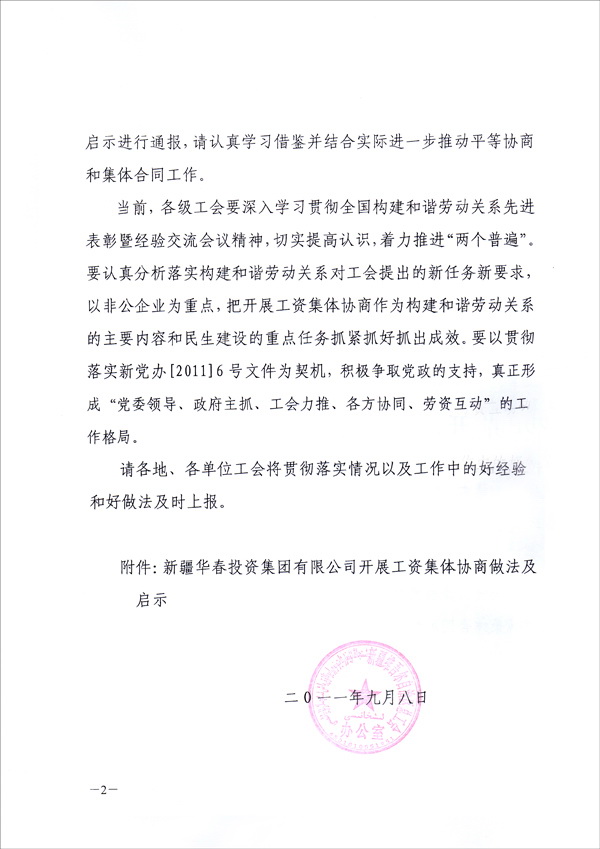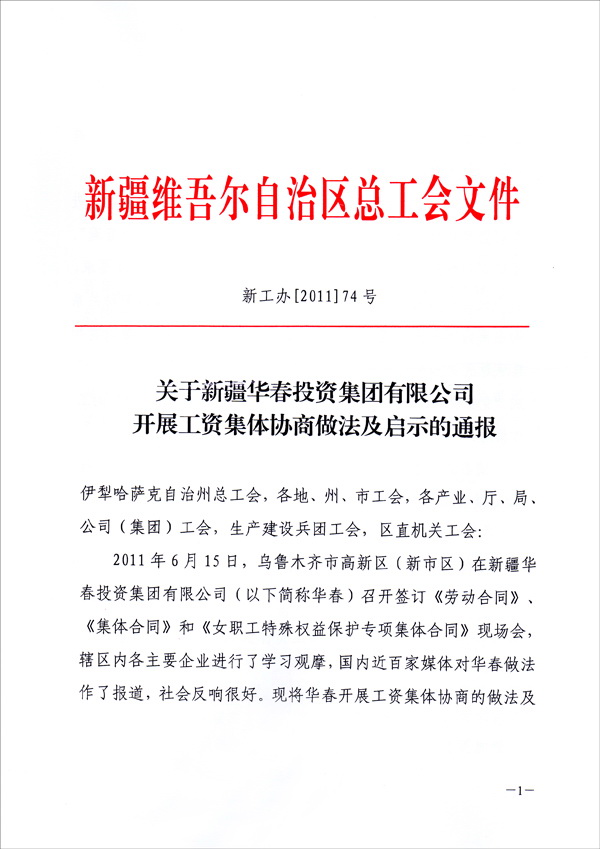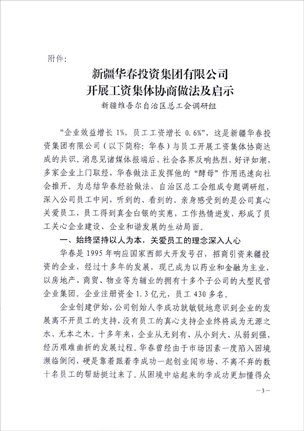 為在全疆推進工資集體協(xié)商、構建和諧勞動關系,新疆維吾爾自治區(qū)總工會于9月8日向全疆各地州、各產業(yè)、廳、局、公司集團、生產建設兵團、區(qū)直屬機關工會,正式下發(fā)了長達十幾頁的“關于新疆華春投資集團有限公司開展工資集體協(xié)商做法及啟示的通報”的紅頭文件,要求全疆認真學習與借鑒。