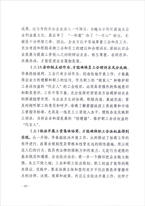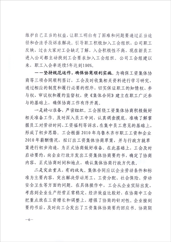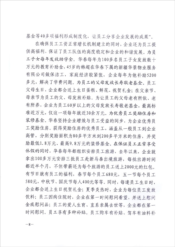 由新疆維吾爾自治區(qū)總工會調研組撰寫的《新疆華春投資集團有限公司開展工資集體協(xié)商做法及啟示》,對新疆華春投資集團和華春工會給予了高度評價,認為新疆華春投資集團的做法與經驗,為推動新疆工資集體協(xié)商工作的開展,起到了很好的典型示范作用。以期通過學習、借鑒華春經驗,把開展工資集體協(xié)商作為構建和諧勞動關系的民生建設重點任務抓出成效。