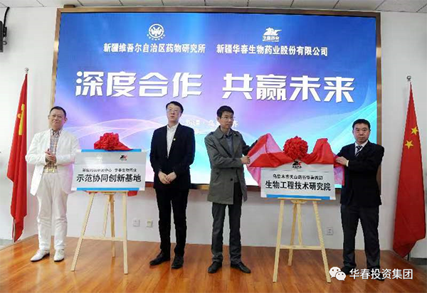新疆華春生物藥業(yè)股份有限公司與自治區(qū)藥物研究所于4月 28日簽訂了深度合作協(xié)議,就雙方合作組建的新疆藥物研發(fā)中心華春生物藥業(yè)示范協(xié)同創(chuàng)新基地、烏魯木齊天山藥谷華春西部生物工程技術(shù)研究院舉行了揭牌。旨在更深層次多方面充分發(fā)揮雙方優(yōu)勢(shì),強(qiáng)強(qiáng)聯(lián)合,實(shí)現(xiàn)共贏。華春投資集團(tuán)董事局李成功主席與自治區(qū)藥物研究所邢建國(guó)所長(zhǎng)以及雙方的相關(guān)管理人員參加了簽約揭牌儀式。