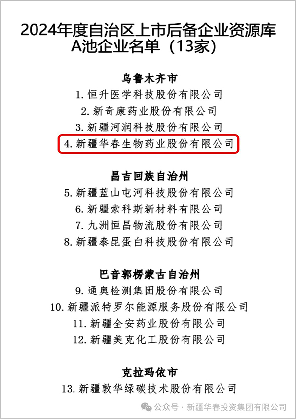 為優(yōu)化充實新疆上市資源,提升自治區(qū)上市后備企業(yè)資源庫整體質(zhì)量,培育更多優(yōu)質(zhì)企業(yè)赴多層次資本市場上市掛牌和融資,讓實體企業(yè)更好地參與和服務建設自治區(qū)“八大產(chǎn)業(yè)集群”,3月4日,自治區(qū)地方金融管理局公示了2024年度入庫上市后備企業(yè)名單,新疆華春生物藥業(yè)股份有限公司(簡稱華春藥業(yè))又被列入后備企業(yè)資源庫A池。