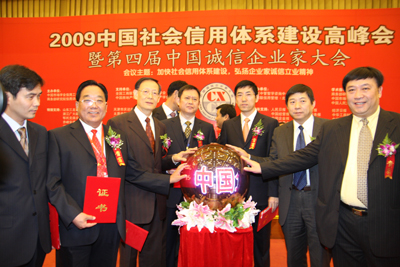 “企業(yè)信用評(píng)價(jià)AAA①級(jí)誠(chéng)信企業(yè)”和“2009中國(guó)十大誠(chéng)信企業(yè)家”獎(jiǎng)項(xiàng),是商務(wù)部研究院信用評(píng)級(jí)與認(rèn)證中心依據(jù)國(guó)家有關(guān)法律法規(guī),按照一定程序,集企業(yè)的債權(quán)債務(wù)管理、合同履行、公共記錄以及財(cái)務(wù)等信息,通過(guò)企業(yè)誠(chéng)信評(píng)價(jià)模型進(jìn)行科學(xué)評(píng)估出來(lái)的,旨在區(qū)分良莠、獎(jiǎng)優(yōu)罰劣,為我國(guó)企業(yè)參與國(guó)內(nèi)外市場(chǎng)競(jìng)爭(zhēng)創(chuàng)造必要的信用條件。信用等級(jí)由低向高依次為A級(jí)、AA級(jí)、AAA級(jí)、AAA①級(jí)。對(duì)信用等級(jí)達(dá)到A級(jí)以上的企業(yè),商務(wù)部都要在國(guó)家級(jí)權(quán)威媒體上進(jìn)行公示。