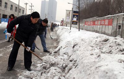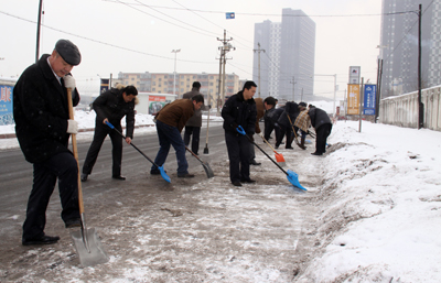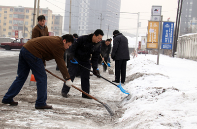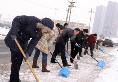 于第二天周六休息日,華春投資集團(tuán)黨委組織全體黨員進(jìn)行了新年的第一次義務(wù)勞動(dòng),掃除通往蘇杭明珠小區(qū)四平路上的積雪,為在這里上班的員工和小區(qū)居民提供了出行的方便。