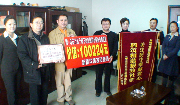 新疆華春投資集團為以實際行動落實黨的十七大關(guān)注民生、構(gòu)建和諧社會的精神,為使社區(qū)及時了解到黨和國家的各項路線方針政策與有關(guān)新聞信息動態(tài),同時感受社會各界對社區(qū)的親切關(guān)注,配合烏魯木齊市萬名干部下社區(qū)的活動,在新春佳節(jié)即將到來之際,出資10萬余元,訂購全年的《新疆經(jīng)濟報》348份,于2月1日贈送到烏魯木齊市萬名干部下社區(qū)領(lǐng)導(dǎo)小組辦公室,將黨報贈送到市委市政府直接聯(lián)系的社區(qū),為基層社區(qū)提供精神食糧。