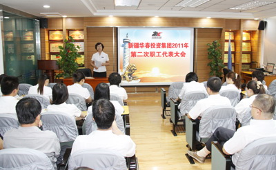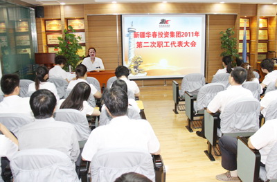 新疆華春投資集團有限公司2011年第二次職工代表大會于7月30日上午在新疆華春投資集團子公司新疆恒潤實業(yè)有限公司培訓(xùn)室召開,會議由高青同志主持。參加會議的應(yīng)到職工代表51人,實到職工代表 49人。