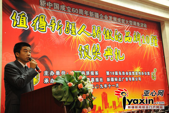 亞心網(wǎng)訊(本網(wǎng)實習記者 張鈺靈)備受矚目的“新中國成立60周年新疆企業(yè)發(fā)展成就大型調(diào)查活動——值得新疆人驕傲的品牌10強”評選活動,11月7日在烏魯木齊南航國際酒店舉行頒獎典禮,當選的十強企業(yè)代表們表示,評選活動讓他們真切地感受到自身品牌的社會影響力,這一榮譽給了企業(yè)莫大的鼓舞,將激勵他們不斷努力,為消費者提供更好的產(chǎn)品和服務(wù)。