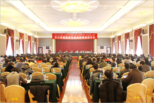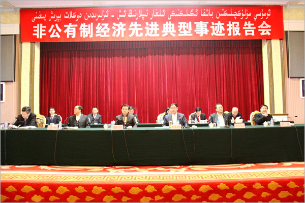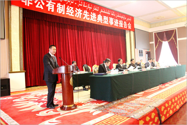 新疆隆重召開非公有制經(jīng)濟先進典型事跡報告會--新疆華春集團有限公司李成功總裁在會上報告先進典型事跡