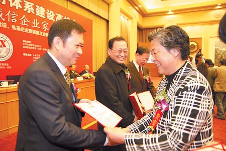 全國(guó)政協(xié)副主席張榕明給新疆華春投資集團(tuán)董事局主席兼總裁李成功(左)頒發(fā)“中國(guó)十大誠(chéng)信企業(yè)家”獎(jiǎng)?wù)伦C書。(圖片由采訪對(duì)象提供)